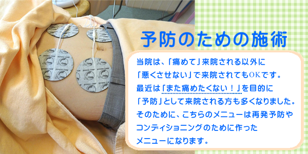 - EMSという機器にて腰痛予防に必要な体幹のインナーマッスルに作用させるメニューになります。 「ぎっくり腰の再発予防」や「体幹トレーニング」の補助としてオススメしています。